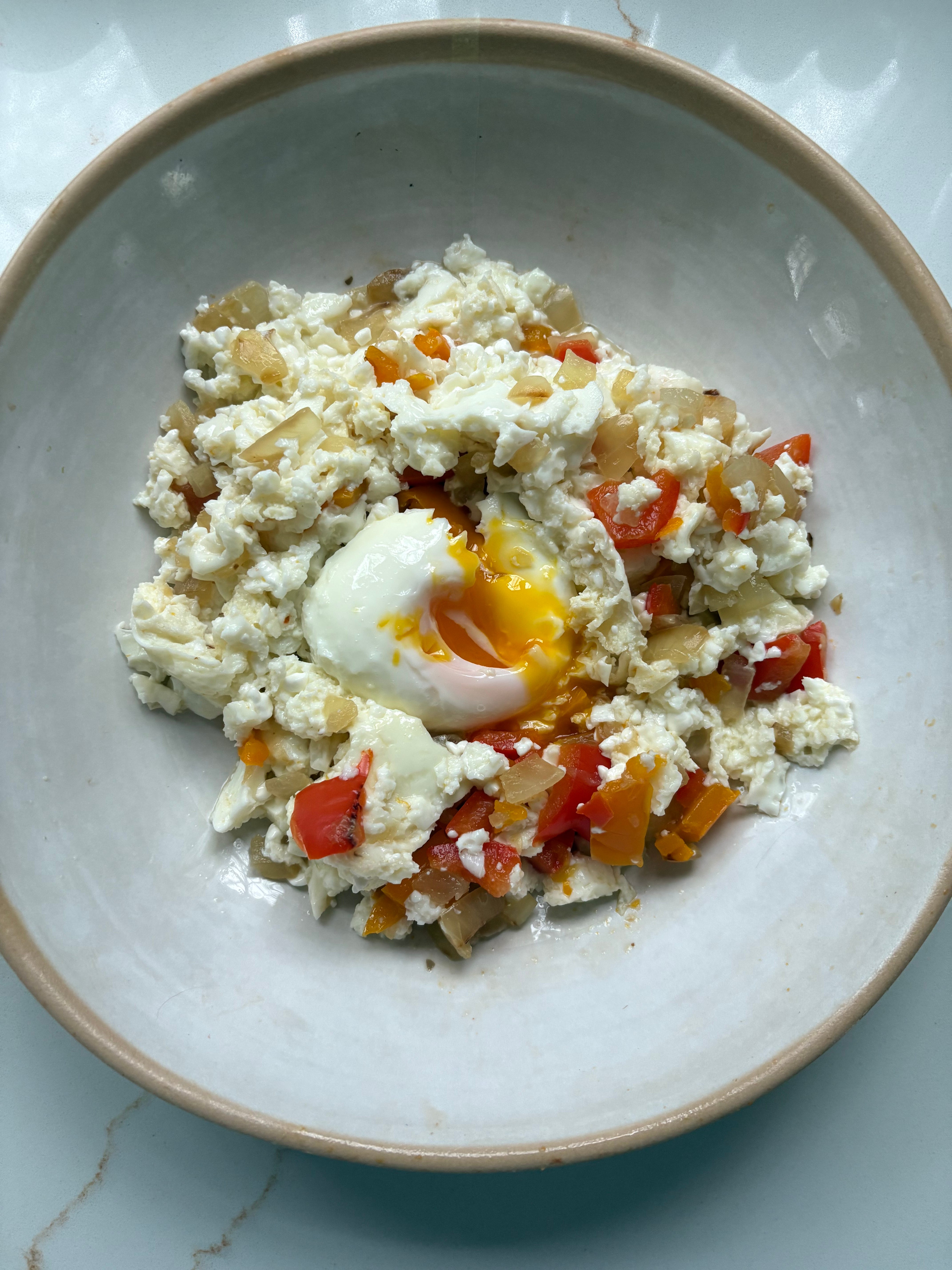 I am such a creature of habit that I tend to eat my favorite meals on rotation. Warning that this will make your entire house smell like onions so be sure to have the extraction fan on full blast and some scented candles near by. The good thing is that it is incredibly easy to throw together. All I did was chop mixed bell peppers and onion, sauté with a dash of olive oil and once cooked add egg whites to the pan and scramble. I added a poached egg on top and of course ate It with a piece of sourdough! I promise that the photo doesn’t do it much justice but it was Devine.